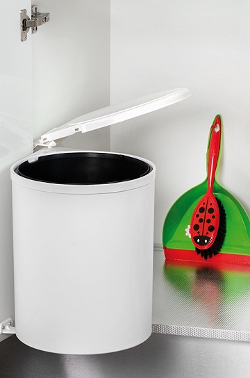 La deschiderea corpului de mobilier, cosul de gunoi se deplaseaza impreuna cu usa, iar capacul ramane in partea interioara.