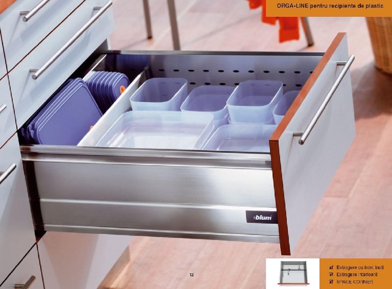 Spatiul de depozitare din extrageri - inclusiv de la cele din dulapul din colt - se poate configura ingenios cu separatoare transversale si longitudinale flexibile. Proviziile sunt bine sprijinite, pot fi scoase usor din sertar si sunt toate vizibile.